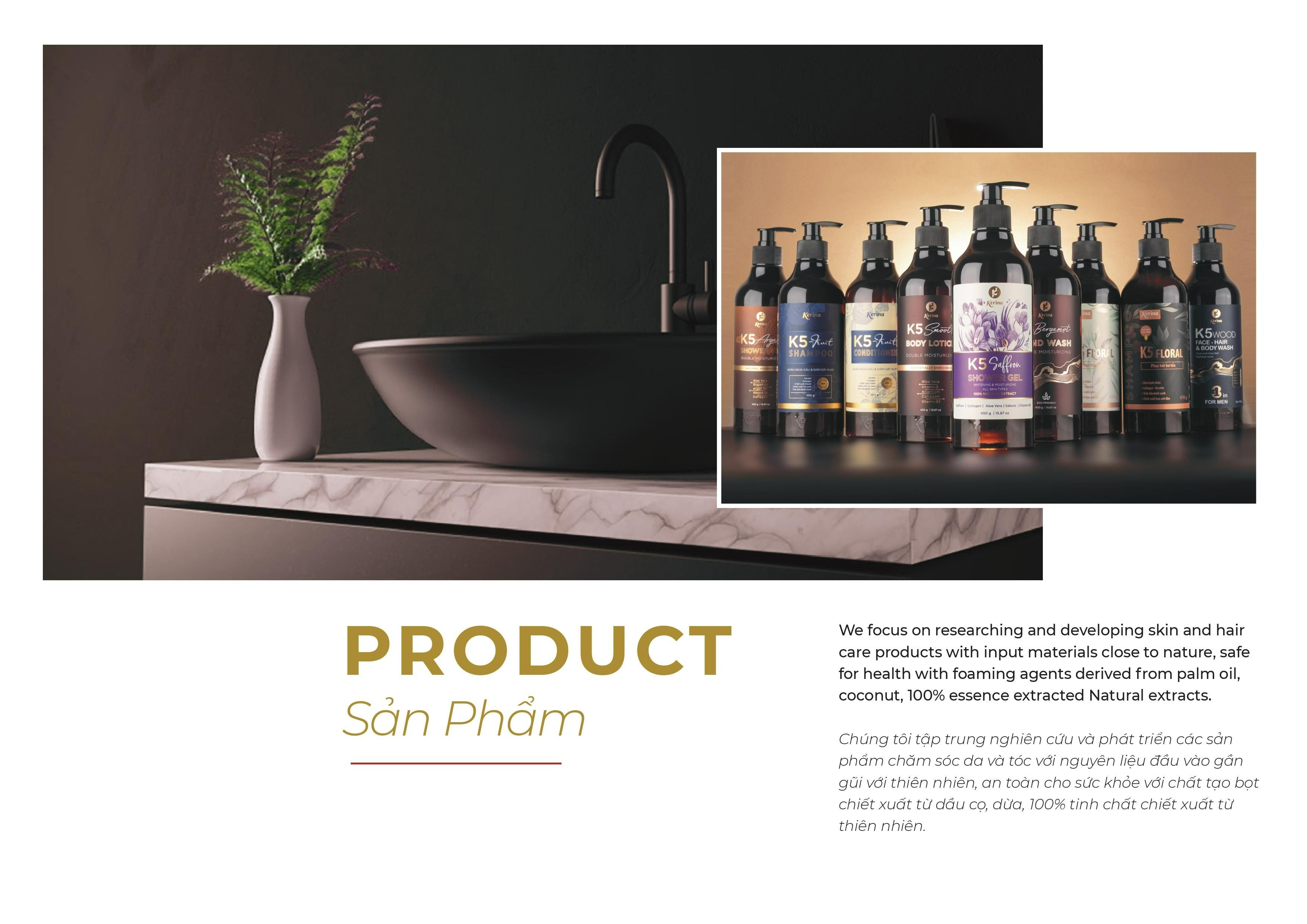 Kerina tập trung nghiên cứu và phát triển các sản phẩm chăm sóc da và tóc với nguyên liệu đầu vào gần gũi với thiên nhiên, an toàn cho sức khỏe với chất tạo bọt chiết xuất từ dầu cọ, dừa, 100% tinh chất chiết xuất từ thiên nhiên.