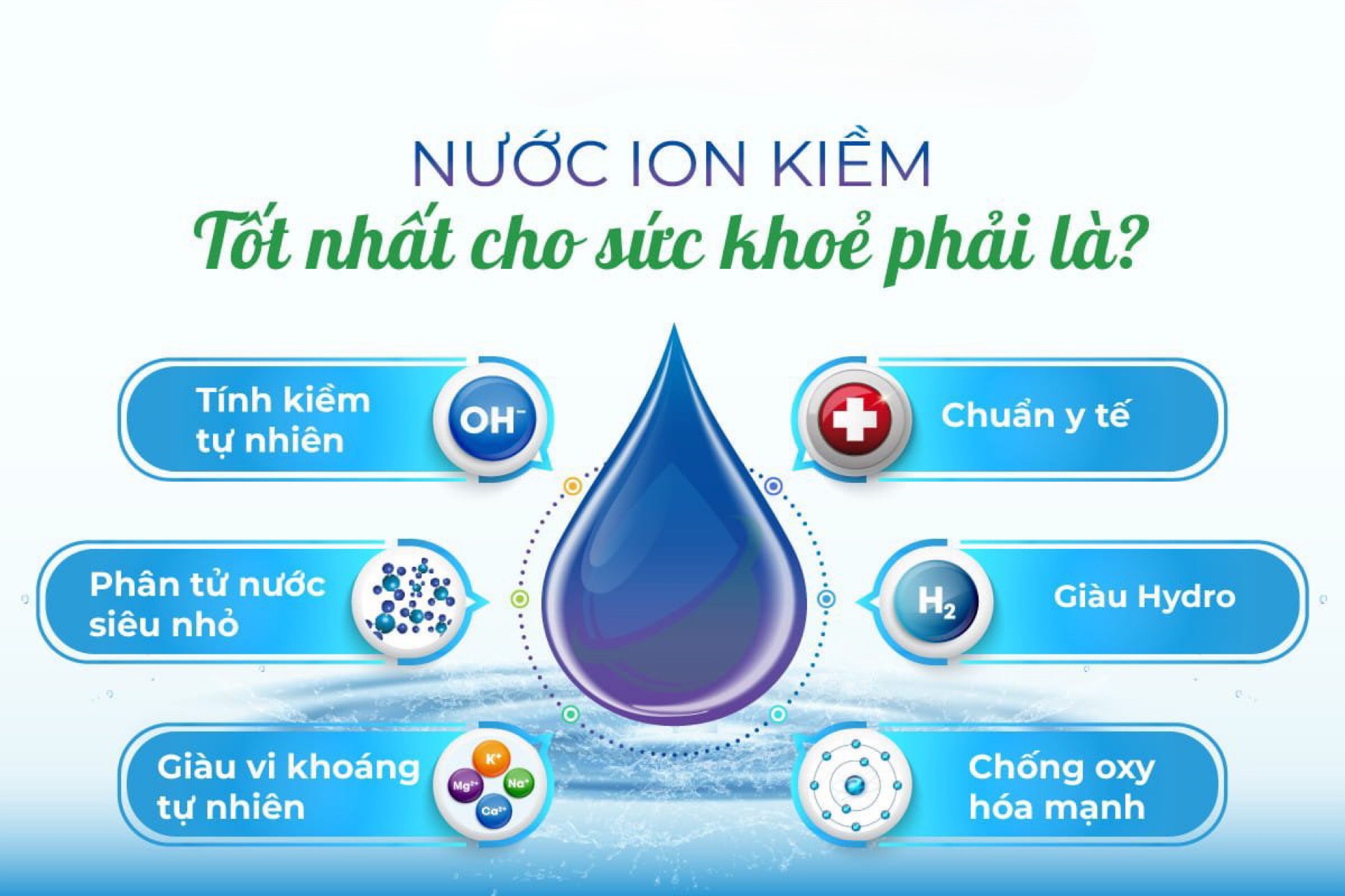 Nước iON kiềm có độ pH ~8.5 – 9.0 – 9.5, là loại nước tốt cho sức khỏe nhờ chứa 4 đặc tính vượt trội cho sức khỏe: giàu Hydro - chất chống oxy hóa mạnh, giàu tính kiềm tự nhiên như rau xanh, giàu vi khoáng tự nhiên có lợi, cấu trúc phân tử nước siêu nhỏ có tác dụng loại bỏ các gốc tự do, tăng cường hệ miễn dịch, làm chậm quá trình lão hóa, trung hòa axit trong cơ thể, phòng ngừa và hỗ trợ điều trị nhiều bệnh như ung thư, tiểu đường, gout, táo bón, dạ dày, rối loạn tiêu hóa…