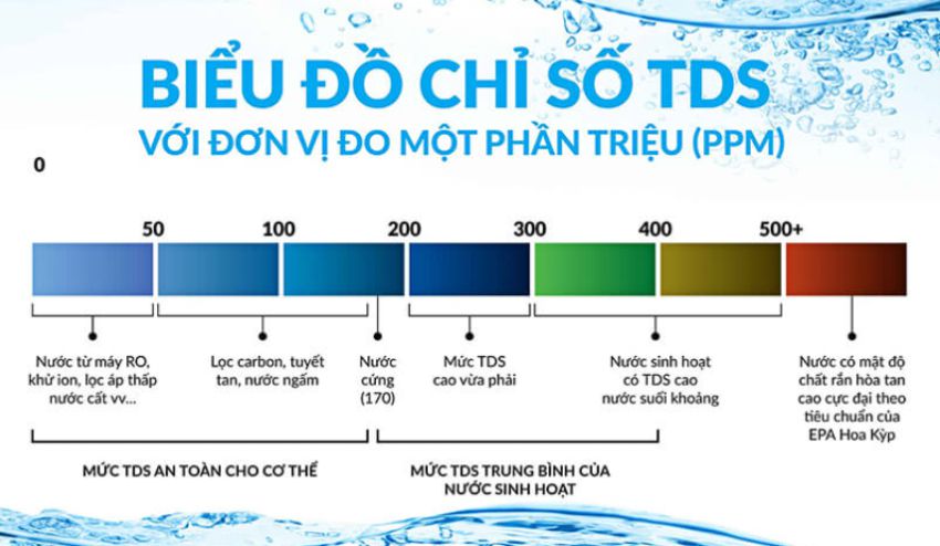 Trong nước ăn, uống, sinh hoạt thì TDS cao hơn nhiều, bởi vì nó chứa các khoáng chất của tự nhiên.