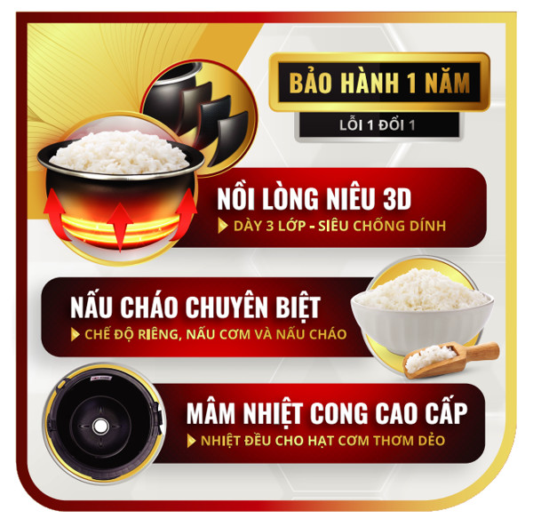 Lòng niêu 3D độc quyền với 3 lớp vật liệu công nghệ tiên tiến, thiết kế đặc biệt với đáy cong dạng niêu đất, kết hợp mâm nhiệt cong ôm sát đáy nồi giúp nhiệt được lan tỏa đều nấu cơm chín đều xốp dẻ