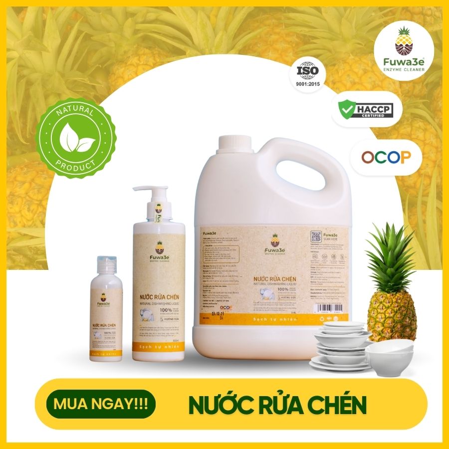 Nước rửa chén sinh học FUWA3E là giải pháp bảo vệ sức khoẻ và môi trường, mang nhiều ưu điểm vượt trội. Sản phẩm đang được nhiều người tiêu dùng tin tưởng về khả năng làm sạch vết dầu mỡ dẫn đầu xu hướng tiêu dùng xanh. Nước rửa chén FUWA3E không sử dụng hóa chất độc hại, FUWA sử dụng các thành phần từ thiên nhiên, áp dụng công nghệ lên men sinh học từ Dứa lấy sức mạnh từ enzyme tẩy sạch dầu mỡ bám trên bát đĩa. Ngoài ra, sản phẩm còn có khả năng phân huỷ cao, đảm bảo sức khỏe người tiêu dùng và không làm ô nhiễm môi trường.