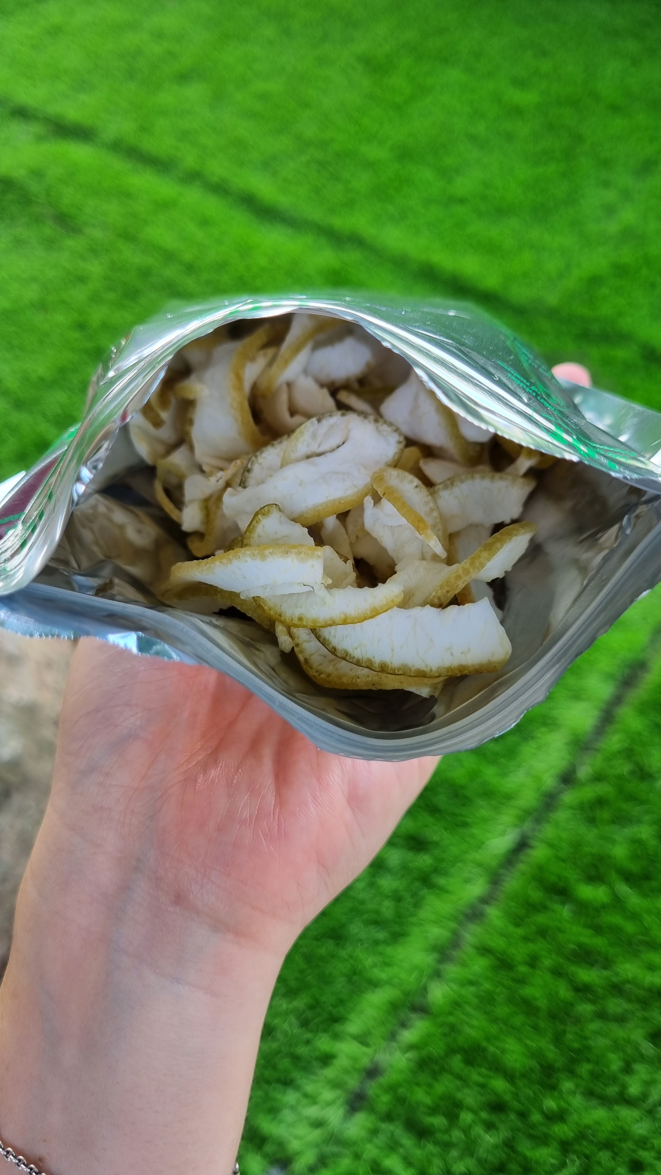 - Vỏ bưởi sấy vị mềm dẻo, vị chua ngọt dịu nhẹ, lát mỏng vừa ăn.