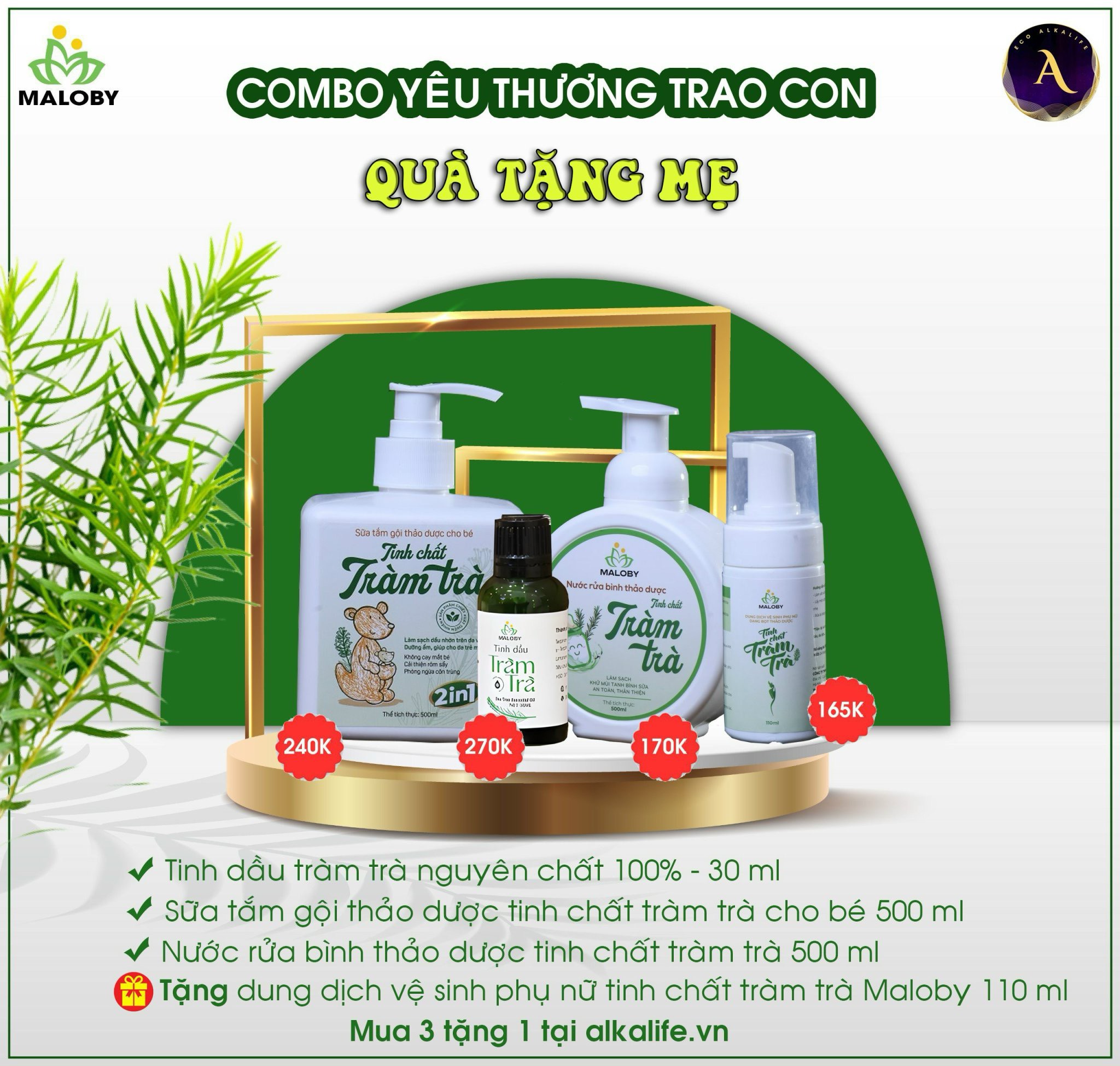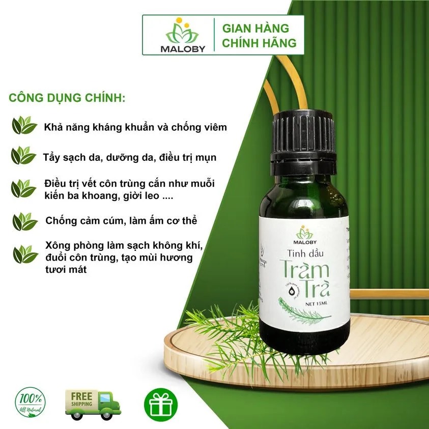 Tinh dầu tràm trà Maloby được chiết xuất từ cây tràm trà có nguồn gốc tại Úc với tên khoa học là Melaleuca Alternifolia. Sản phẩm được trồng trên vùng nguyên liệu sạch rộng gần 50ha lớn nhất Việt Nam và được sản xuất trong 12h kể từ khi thu hái với quy trình chưng cất hơi nước hiện đại đem lại chất lượng tinh dầu cao nhất. Với 28-30 hợp chất khác nhau trong đó có các thành phần chính như Terpinen – 4 – ol > 30%; γ terpinenen và α terpinenen; cineol. Với đặc tính kháng khuẩn, dưỡng da sản phẩm là Thần Dược đối với các làn da bị mụn, vẩy nến, á sừng hoặc các bệnh ngoài da liên quan tới vi khuẩn. Đặc biệt sử dụng tinh dầu Tràm Trà Maloby thường xuyên còn giúp làn da nhanh chóng phục hồi sau hư tổn, căng bóng và mềm mại tự nhiên, giảm bã nhờ và các nguy cơ về mụn, thâm đen…
