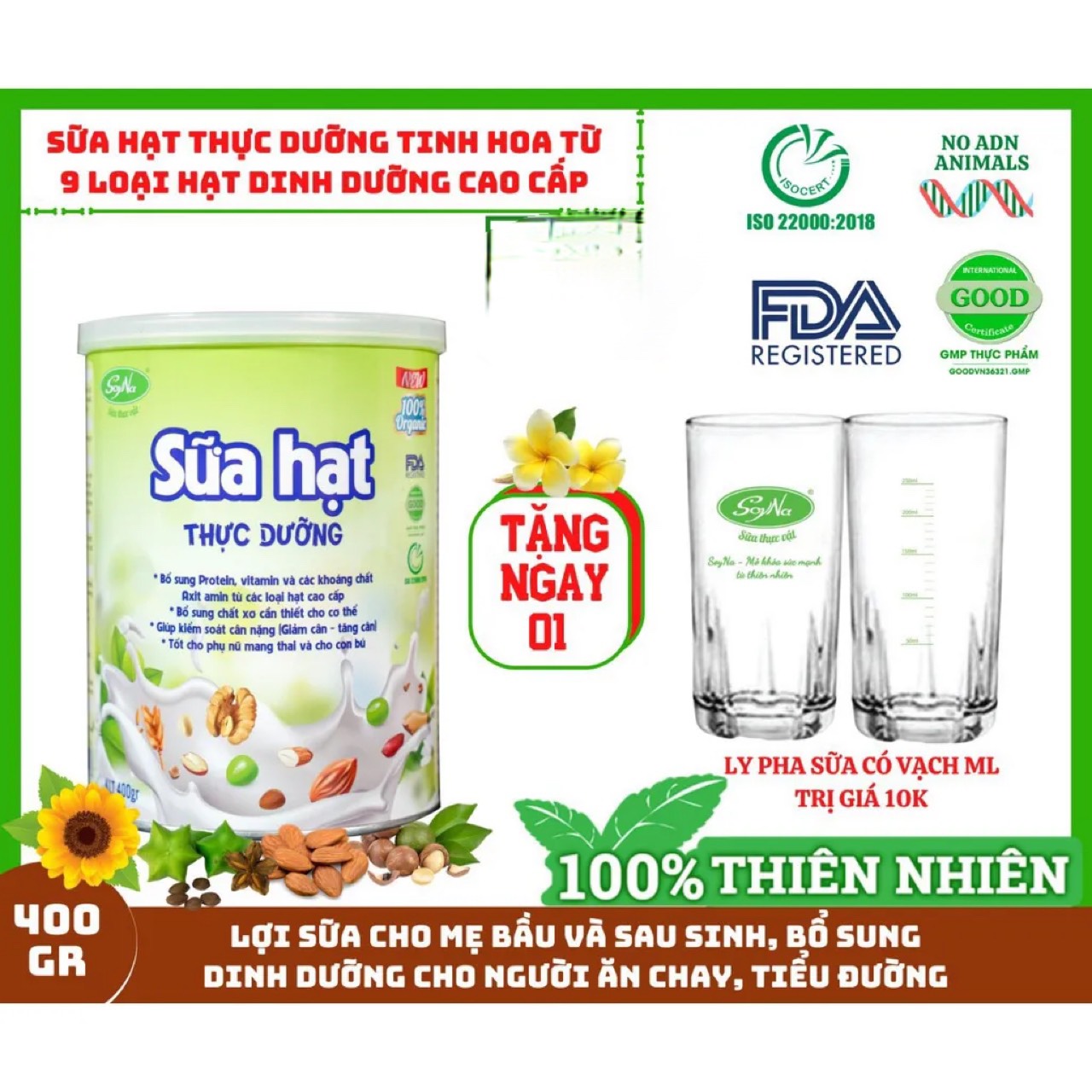 Ngoài ra, sữa hạt thực dưỡng SoyNa có nguyên liệu 100% từ thiên nhiêm, đảm bảo tiêu chuẩn âm tính với ADN động vật. Do vậy, cũng được sử dụng như 1 bữa ăn dinh dưỡng hoàn hảo cho người ăn chay hoặc kiêng ăn thịt.