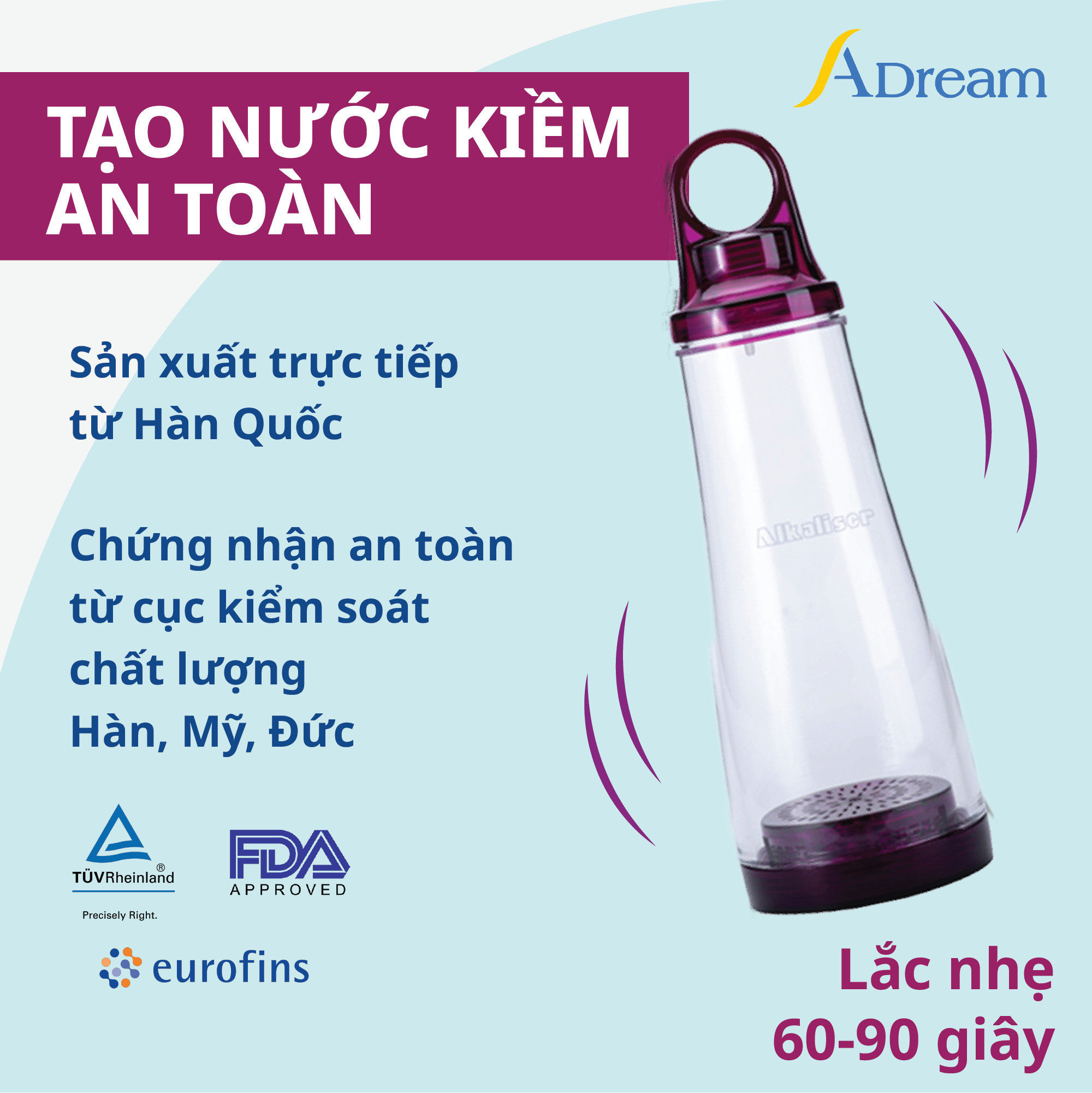 Tạo nước kiềm an toàn chỉ sau 2 phút với 60-90 giây lắc nhẹ, bạn sẽ không thể tìm được cách nào để tạo ra nước kiềm an toàn và tiện lợi hơn bình lọc nước tạo kiềm Alkaliser.