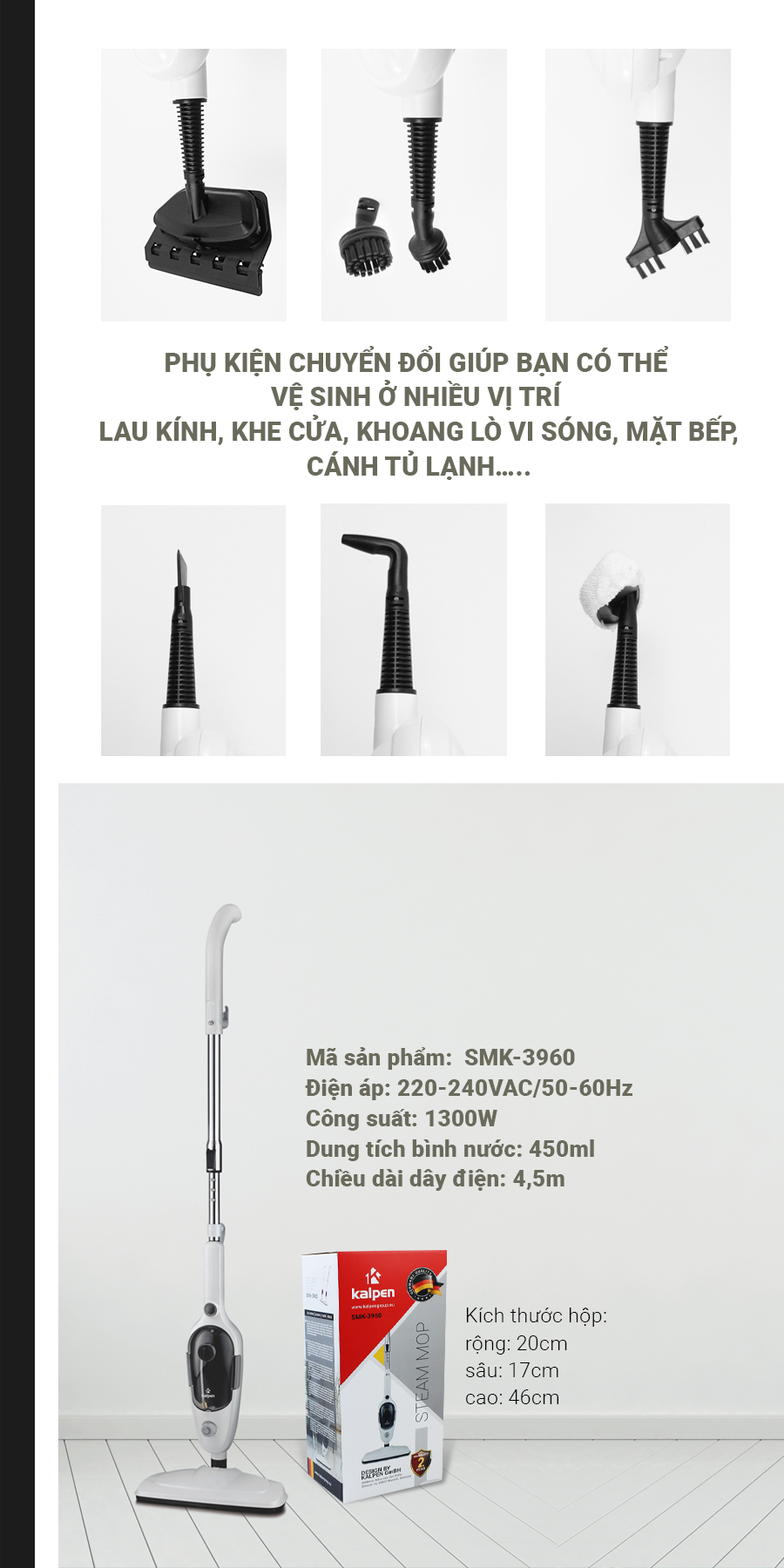 Thông số kỹ thuật của Cây Lau Nhà Diệt Khuẩn Bằng Hơi Nước Nóng Siêu Nhiệt Kalpen SMK-3960
