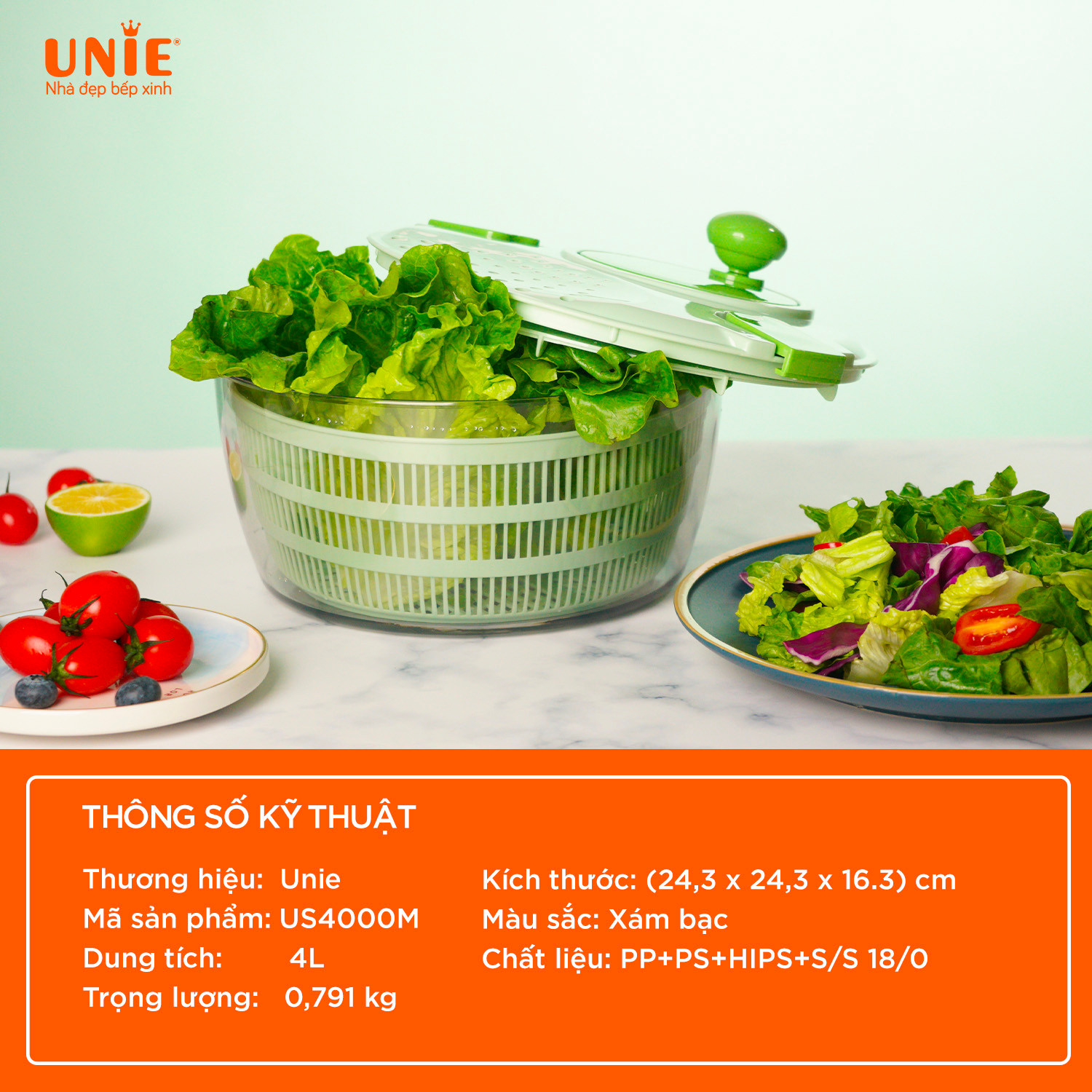 Rổ quay rau của USM4000M có công dụng làm khô thực phẩm nhanh chóng mà không làm dập nát . Khi quay, lực ly tâm sẽ làm cho thực phẩm quay quanh rổ đẩy nước ra ngoài chậu trong suốt và làm khô hiệu quả. Do lực quay bằng tay nên dễ dàng kiểm soát tốc độ và lực quay cho từng loại thực phẩm đảm bảo không dập nát.