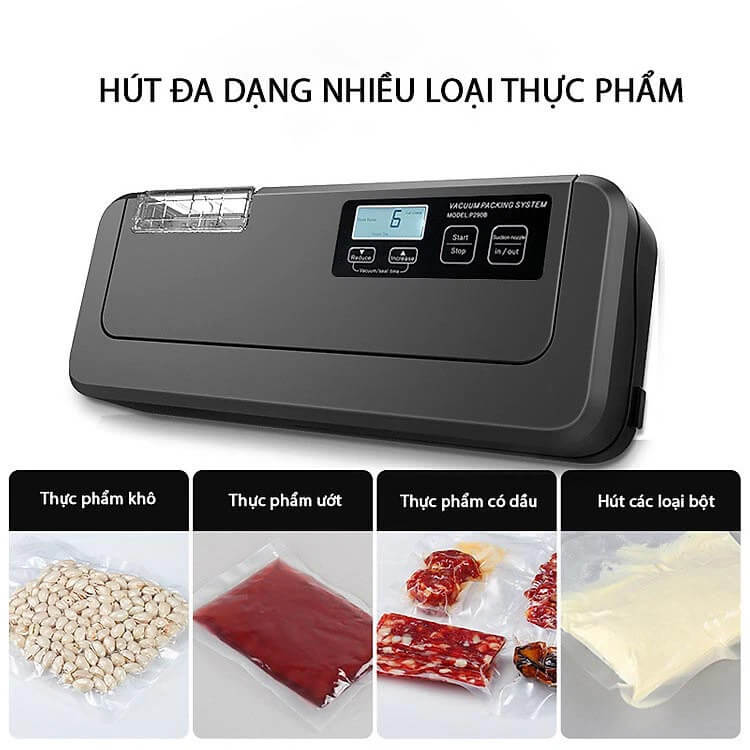 Máy hút chân không P290B được tích hợp thêm khay chứa nước ở mặt phía sau, tác dụng chứa nước khi hút chân không thực phẩm ướt. Máy có thể đóng gói đa dạng các loại thực phẩm như: Thủy, hải sản; thịt tươi; chả cá; chả giò; xúc xích; măng tươi và các loại thực phẩm khô khác.