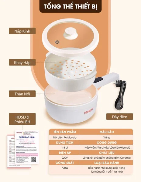 - 6in1 chế độ: Đun sôi, xào, hấp, giữ ấm, ăn lẩu, nấu canh. Tiện lợi, nấu nướng nhanh chóng, không tốn diện tích, không tốn thời gian, tiết kiệm tối đa cho bạn và gia đình