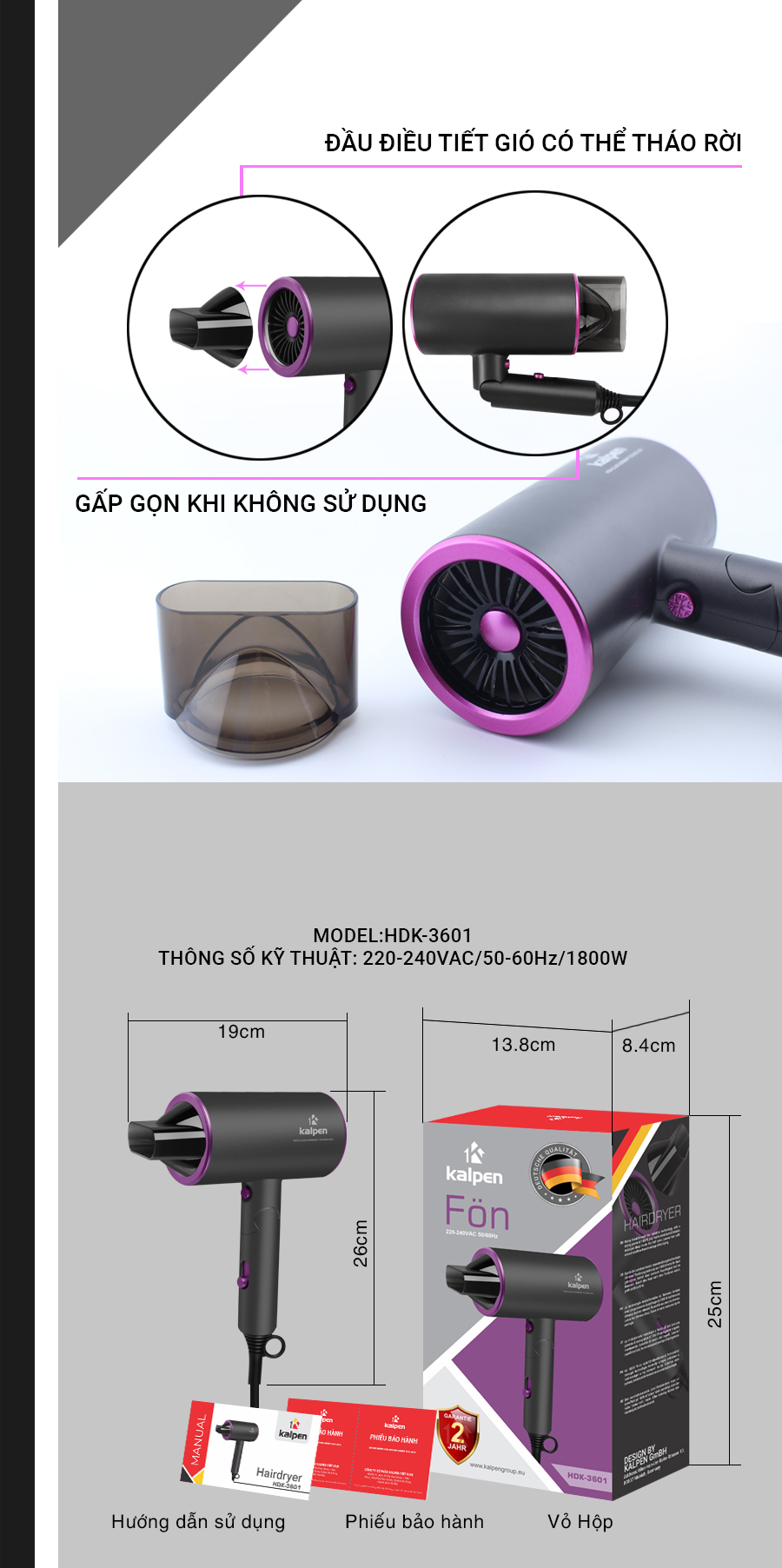 - Máy sấy tóc mang thương hiệu Kalpen ra đời được trang bị những tính năng vô cùng nổi bật, giúp người sử dụng có thể tối đa hóa những công dụng mà nó mang lại, đồng thời Kalpen còn hướng đến một chiếc máy sấy tóc thiết kế vô cùng tiện lợi có thể đồng hành cùng bạn đi khắp mọi nơi.