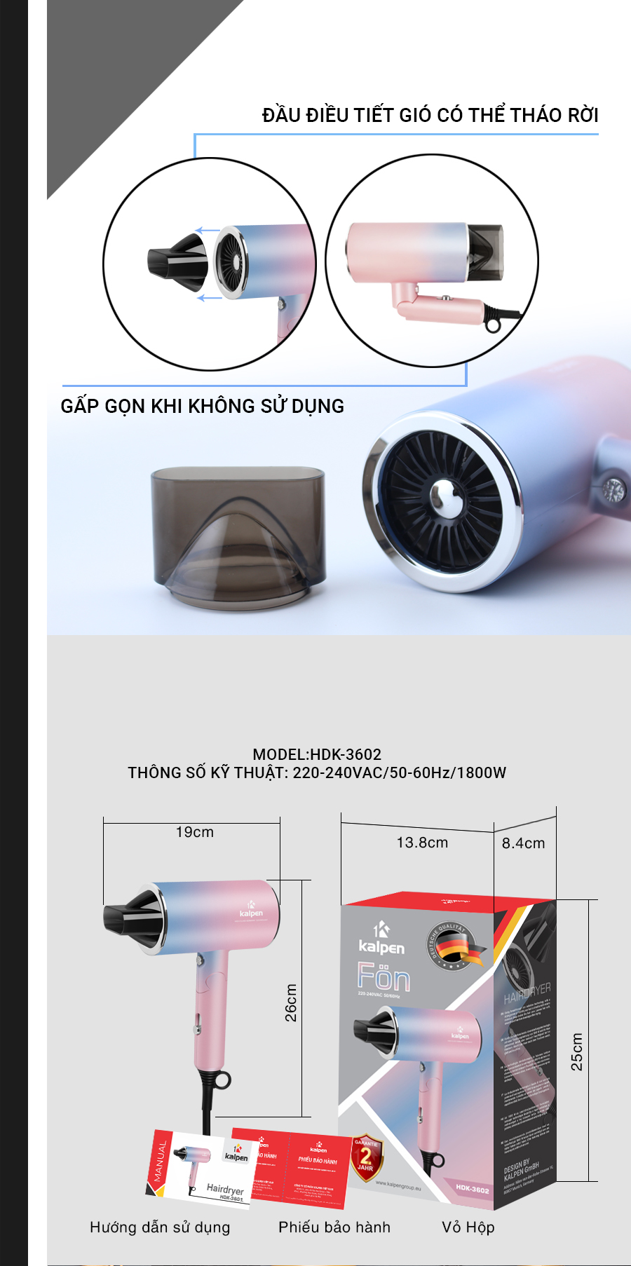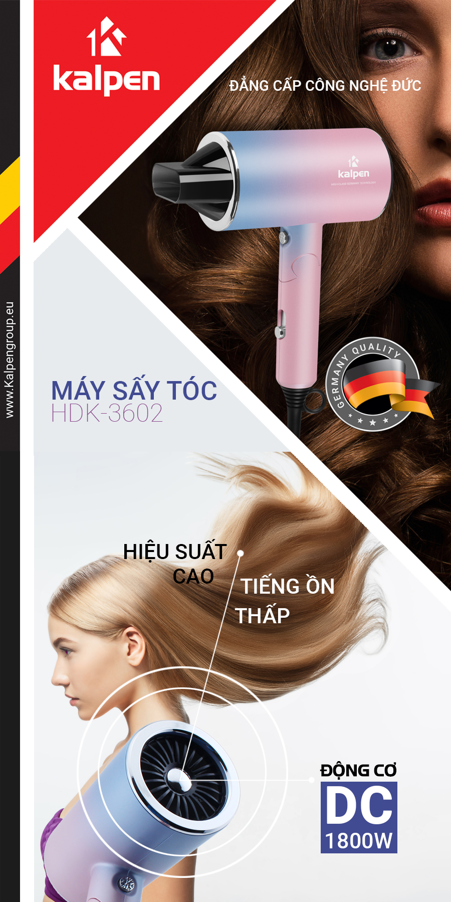 - Máy sấy tóc mang thương hiệu Kalpen ra đời được trang bị những tính năng vô cùng nổi bật, giúp người sử dụng có thể tối đa hóa những công dụng mà nó mang lại, đồng thời Kalpen còn hướng đến một chiếc máy sấy tóc thiết kế vô cùng tiện lợi có thể đồng hành cùng bạn đi khắp mọi nơi.