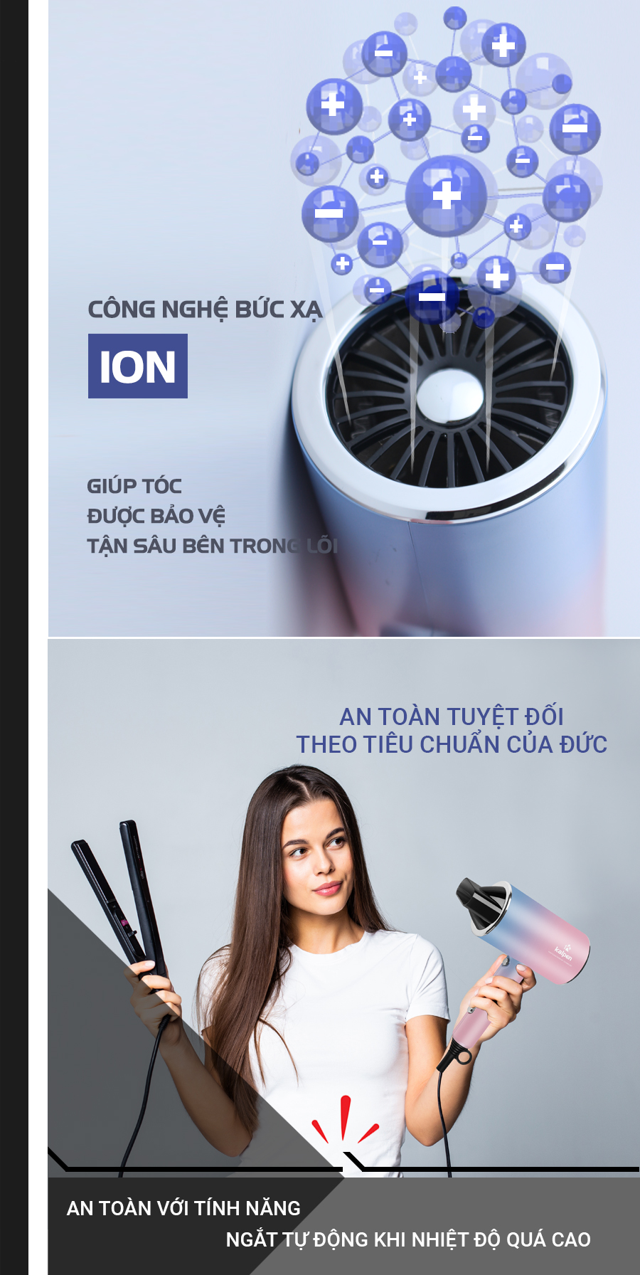 - Công nghệ đột phá : Sử dụng công nghệ bức xạ Ion giúp tóc được bảo vệ sâu tận bên trong lõi tóc và không lo lắng tóc bị khô và gẩy rụng.