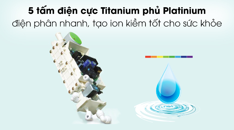 Máy lọc nước ion 5250 được trang bị 5 tấm điện cực mang lại khả năng điện phân cực lớn, tạo nước nhanh hơn gấp nhiều lần so với các loại máy lọc nước đang có trên thị trường. Hơn nữa, các tấm điện cực titanium được phủ bằng kim loại quý Platinum có tuổi thọ bền chắc tới 30 năm.