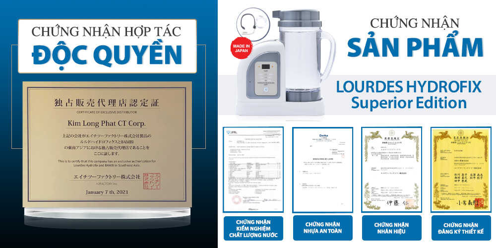 Máy tạo nước và khí giàu Hydro Lourdes Hydrofix đạt nhiều chứng nhận về chất lượng và được tin dùng trên toàn thế giới: kiểm nghiệm chất lượng nước, chứng nhận nhựa an toàn, chứng nhận tên nhãn hiệu, chứng nhận đăng ký thiết kế…