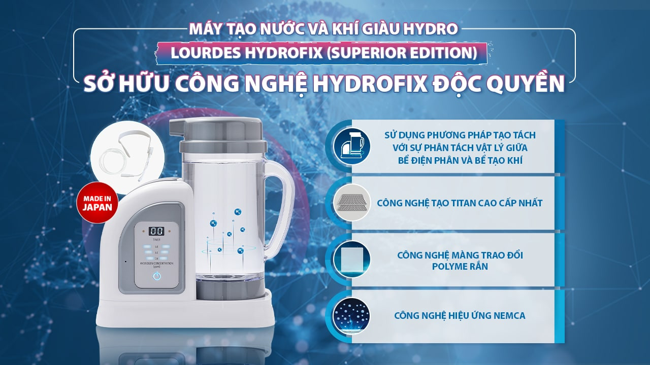 Lourdes Hydrofix (Superior Edition) là máy tạo nước và khí giàu Hydro, sở hữu công nghệ Hydrofix độc quyền thế hệ mới, được sản xuất bởi công ty sản xuất máy Hydro số 1 tại Nhật Bản – H2 Factory Inc., Nhật Bản.