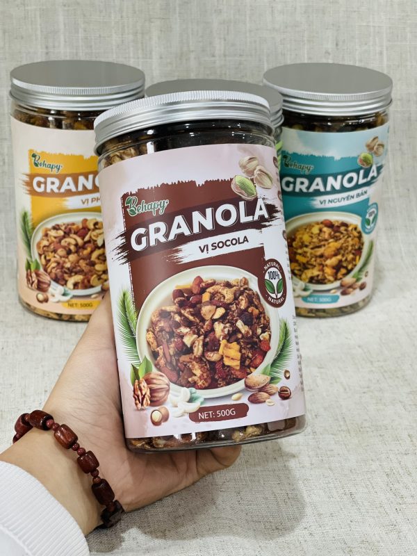 Hạt điều, hạnh nhân, óc chó, macca, bí xanh, bột matcha, yến mạch, dứa, xoài sấy dẻo, việt quất, nho, mật hoa dừa