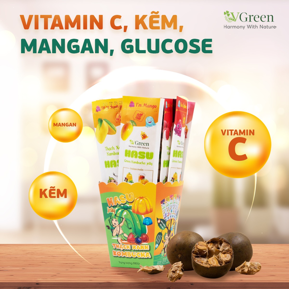 - Chứa nhiều dưỡng chất cần thiết: Thạch xanh Kombucha Hasu được làm từ Kombucha lên men tự nhiên từ trà xanh, hoa quả nên chứa nhiều dưỡng chất cho cơ thể như: vitamin A, C, nhóm B, acid glycuronic... giúp cải thiện hệ miễn dịch, tăng sức đề kháng, hỗ trợ hệ tiêu hóa, giúp da thêm đẹp, dáng thêm xinh.