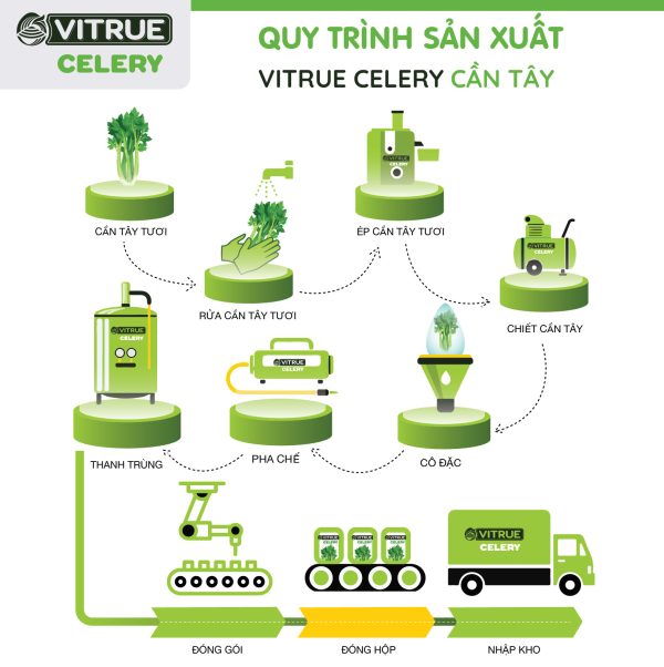 Mỗi cây cần tây đều được tuyển chọn kỹ lưỡng trước khi đưa vào nhà máy. Tại đây, cần tây được rửa sạch, ép nước, chiết lấy tinh chất trong bã. Sau đó tinh chất và nước ép được tổng hợp lại, cô đặc, khử trùng, kiểm tra chất lượng và đóng gói. Tất cả quy trình đều được thực hiện tự động 100%, khép kín và có sự giám sát của các chuyên gia.