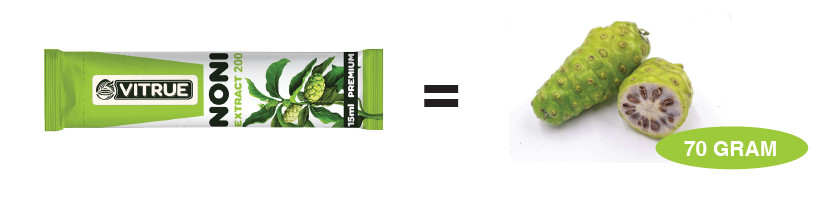 1 gói tinh chất trái nhàu VITRUE Noni chứa hoạt chất tương đương với 70 gam trái nhàu tươi chín.
