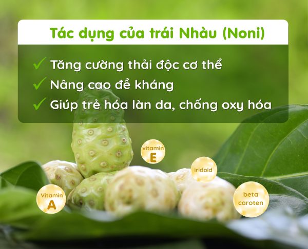 Trái Nhàu (tiếng anh là Noni) là một vị thuốc cổ truyền đã được Đông y tin dùng trong nhiều thế kỷ nay. Trong trái nhàu chứa Proxeronine, khi vào cơ thể sẽ được chuyển hóa thành Xeronine. Đây là là một chất giúp nuôi dưỡng và kích hoạt tế bào, hoạt hóa hơn 220 loại enzyme của các phản ứng sinh hoá trong cơ thể. Trong đó có các phản ứng của quá trình thải độc tại gan, tại thận, tại phổi. Ngoài ra trái nhàu còn chứa Neolignan và Americanin A là các chất chống oxy hóa, chống gốc tự do mạnh.
