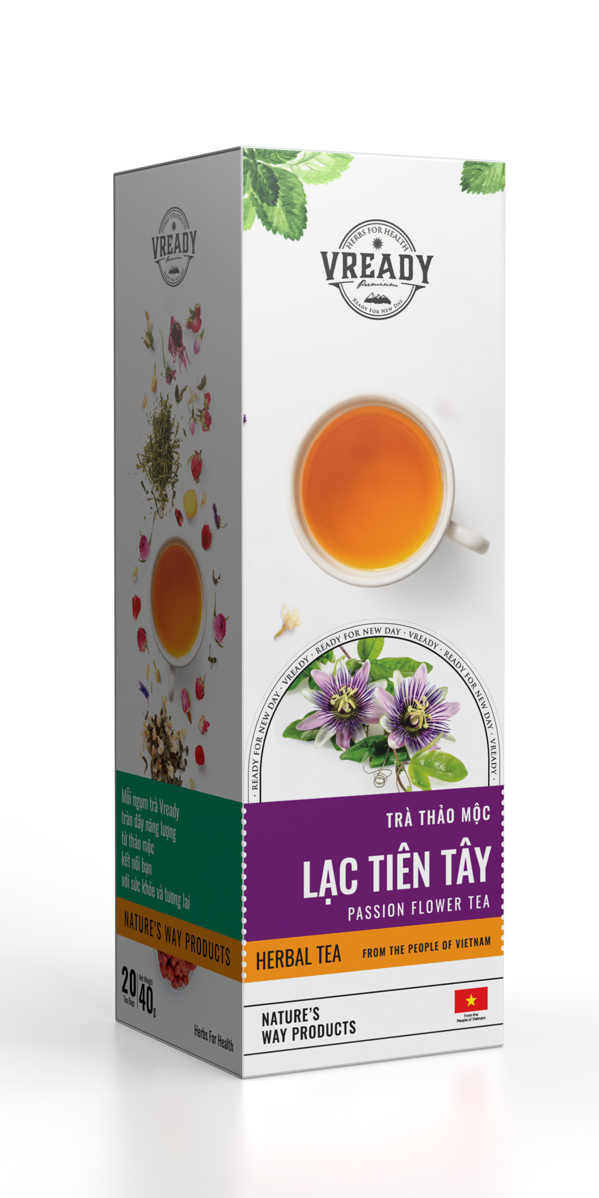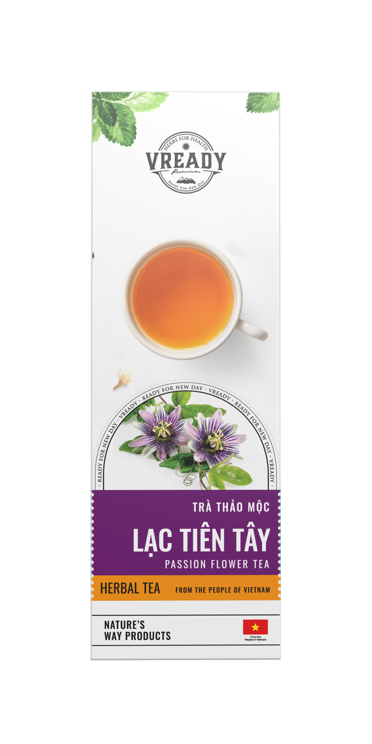 Trà Lạc Tiên Tây Vready là sự kết hợp giữa các dược liệu truyền thống (Lạc tiên, Vông nem, Tâm sen) và áp dụng phương pháp đóng gói hiện đại đạt tiêu chuẩn ISO 22000:2018. Việc này nhằm giữ nguyên hương vị tinh tế của trà, trong khi vẫn đảm bảo được hàm lượng dược chất có lợi cho sức khỏe. Không chỉ giúp ngủ ngon, giảm căng thẳng, Trà Lạc Tiên Tây còn là thức uống giải khát hàng ngày. Vready giúp bạn chăm sóc cơ thể từ những thói quen nhỏ nhất.